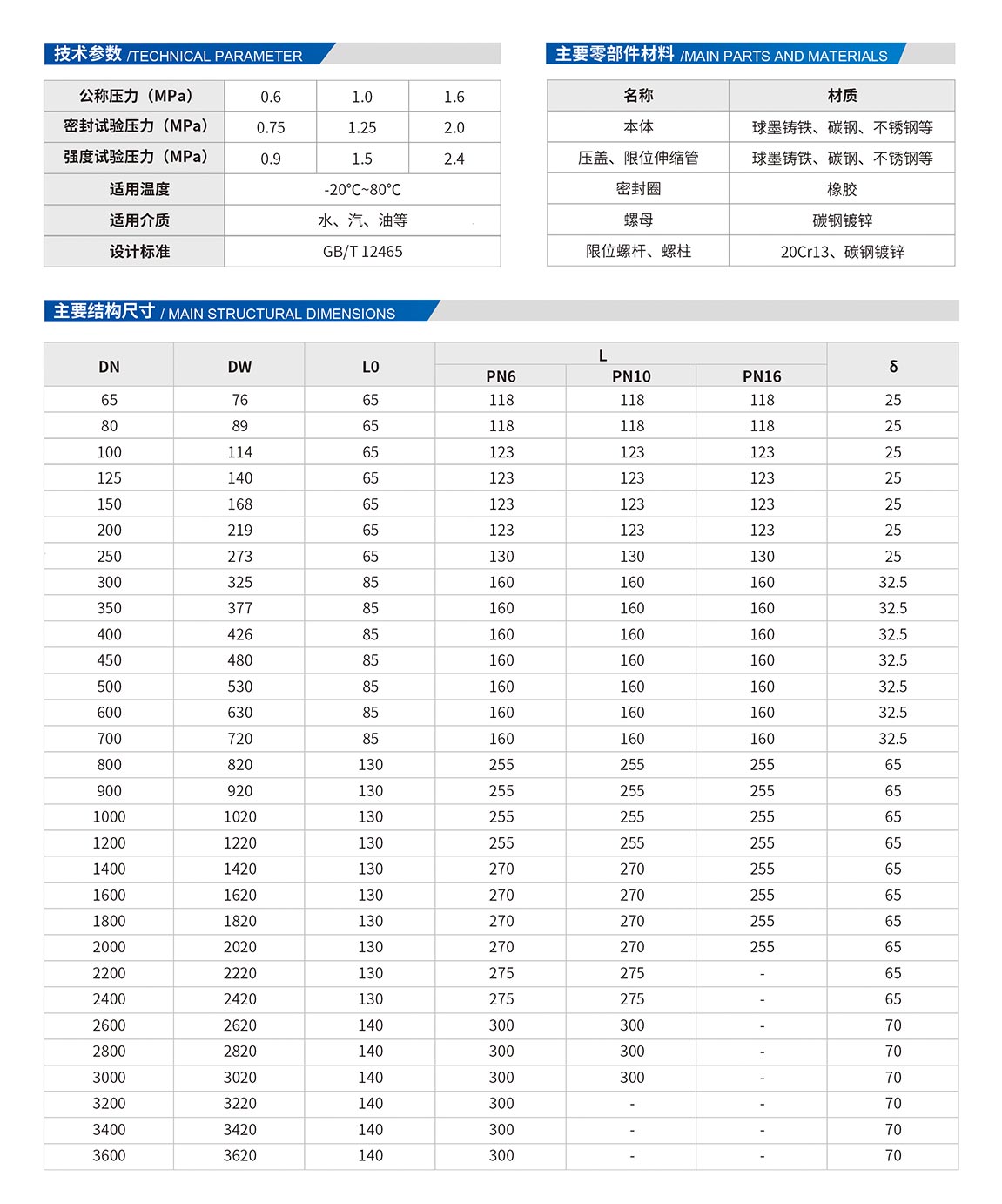 松套限位補償接頭安裝在管道上后,擰緊螺母,起到密封和連接作用。當溫度變化時,管子能在接頭中間自由地伸縮,當地基下沉、偏斜,它均能確保密封無滲漏,從而達到自動補償之目的。