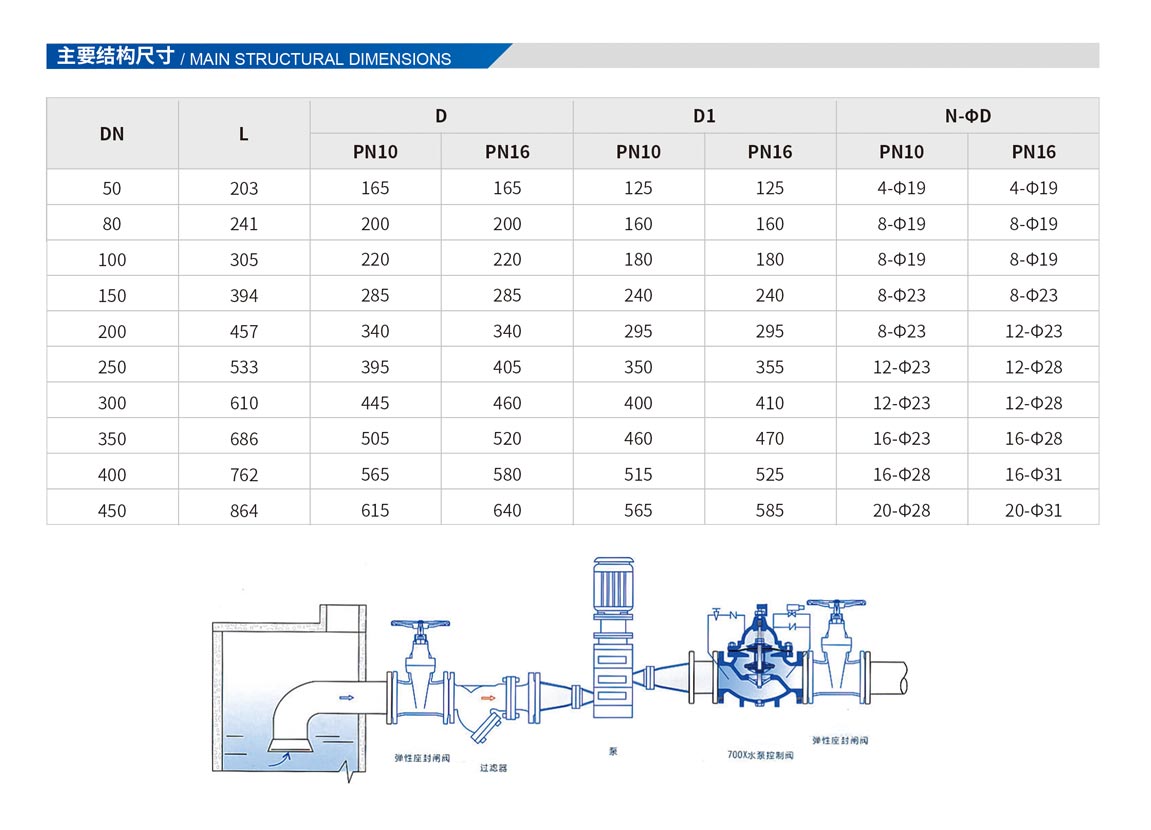 700X水泵控制閥,是一種安裝在高層建筑以及其他給水系統的水泵出口處,防止介質倒流的逆止類閥門。當水泵即將停止供水前,閥門先行緩幔關閉90%左右,防止突然停泵而產生的水錘和水擊聲:當水泵完全停止后,閥門再完全關閉,防止泵出的水回流,有效地保護水泵,免受回流的沖擊而產生反轉。該產品是水泵出口必不可少的保護裝置。閥門呈流線型設計,通過電磁閥的導控實現準確的啟閉,使用安全可靠,有效地防止水錘和水擊聲,使用壽命長,安裝、維修方便。