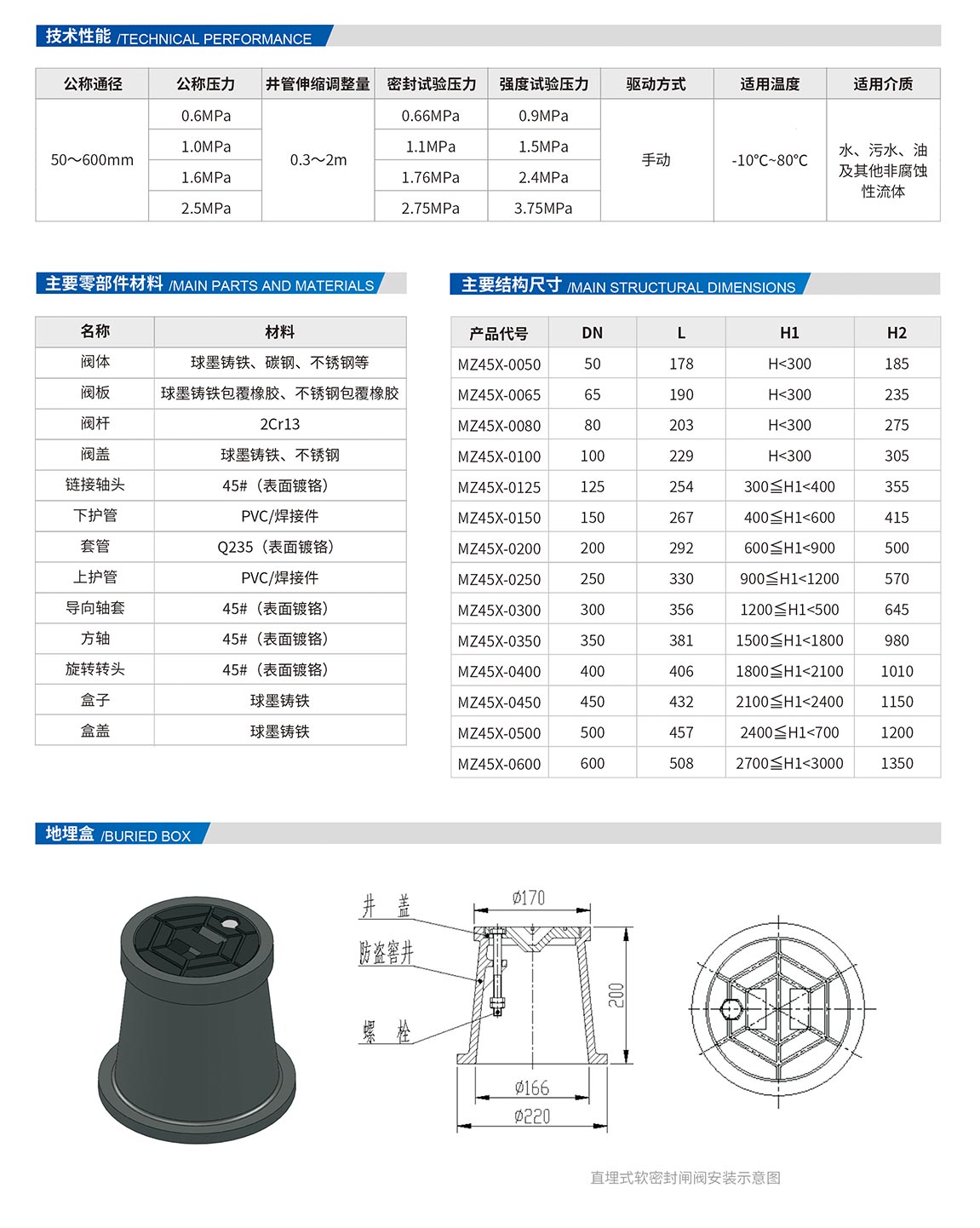 直埋式軟密封閘閥由閥門、地埋裝置(包括伸縮桿、伸縮護套、地埋盒)等部分組成。其閥門部分除了具有軟密封閘閥的所有特點之外,還具備先進的烤漆層防腐技術,閥體不會生銹,確保三十年免維護。由于軟密封閘閥使用壽命長,性能穩定,在軟密封閘閥基礎上添加了一個伸縮桿、伸縮護套,并配以地埋盒,形成直埋式軟密封閘閥,特點如下: