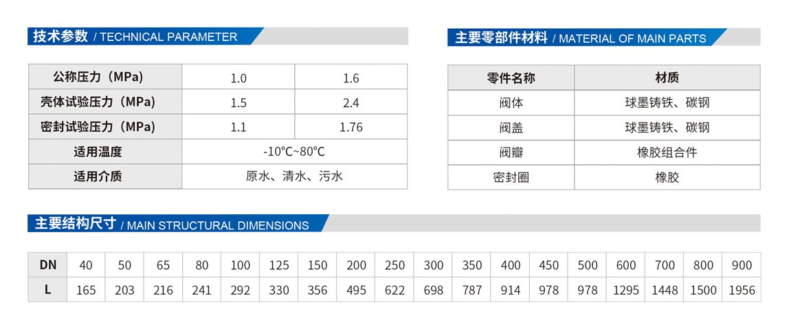 采用全流面積式設計,水頭損失小,不易堆積雜物,密封采用斜板式設計,關閉行程短,閥瓣采用橡膠與鋼板經高溫壓制而成,耐沖涮,密封性能好,產品結構簡單、維護和保養方便。